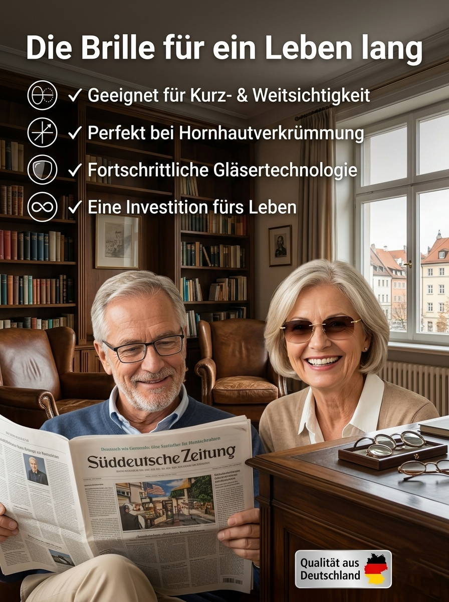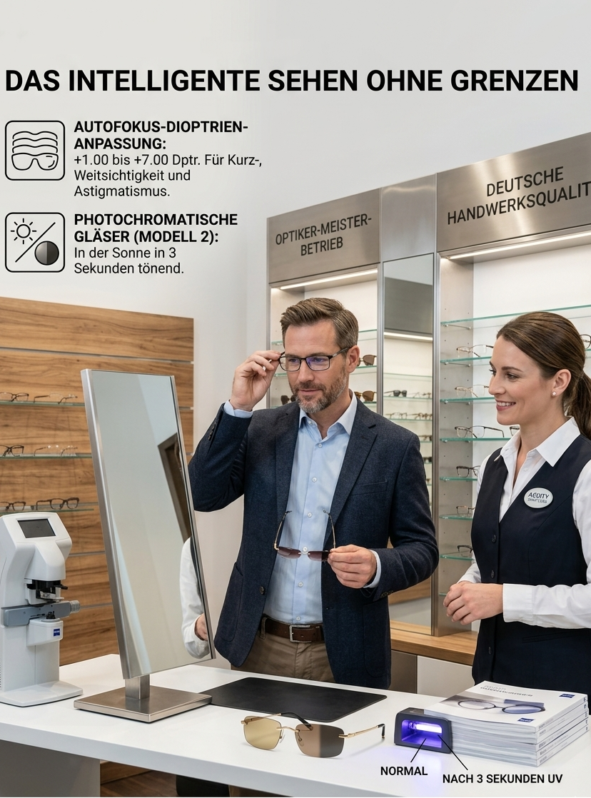 Die Linsenstärke passt sich automatisch an Veränderungen der Sehkraft an; neueste phototrope Gläser ändern ihre Farbe entsprechend der Umgebungshelligkeit.