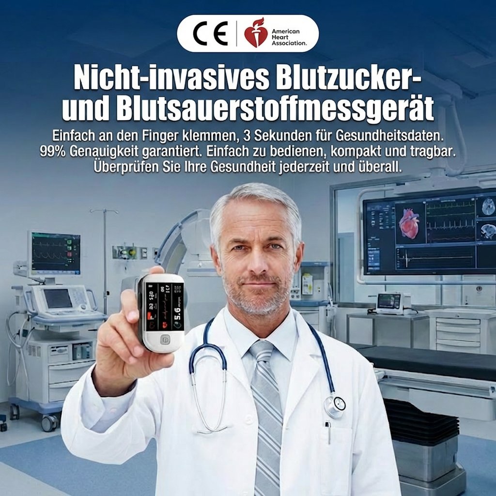 Von führenden Kardiologen empfohlen: Einfach am Finger anbringen und in drei Sekunden Blutzucker, Sauerstoffsättigung und Herzfrequenz messen, mit einer Genauigkeit von 99,9%.