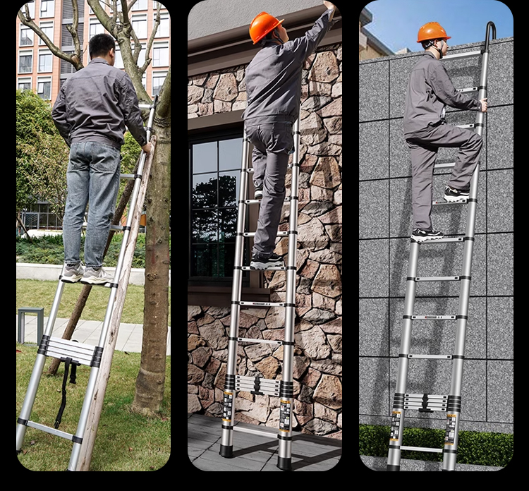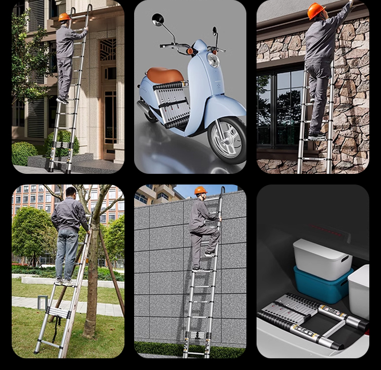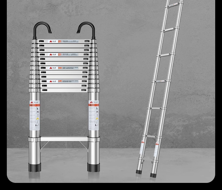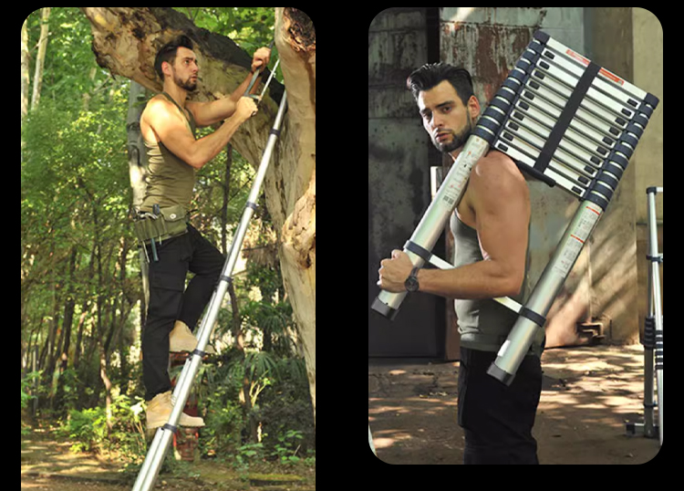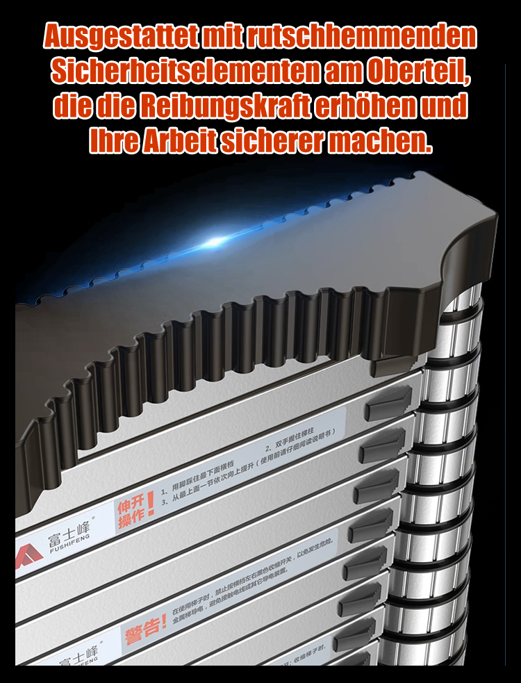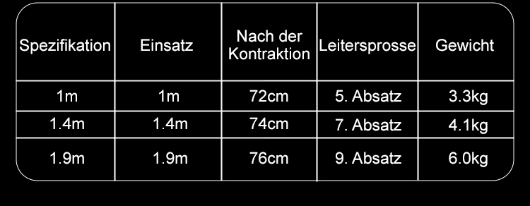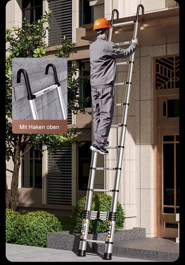 Die Leiter lässt sich in 3 Sekunden ein und ausziehen, höhenverstellbar von 2 bis 6 Metern