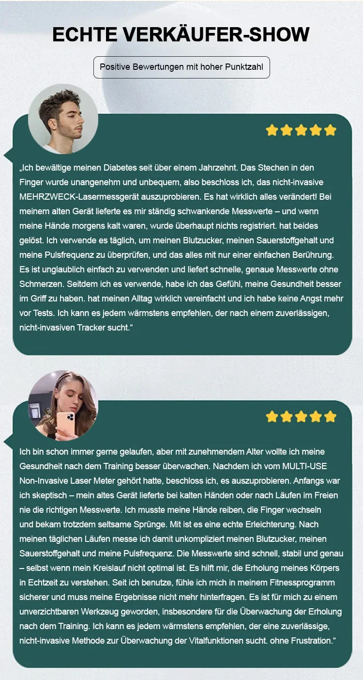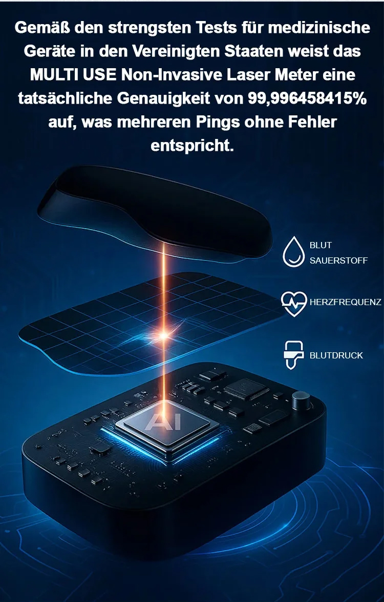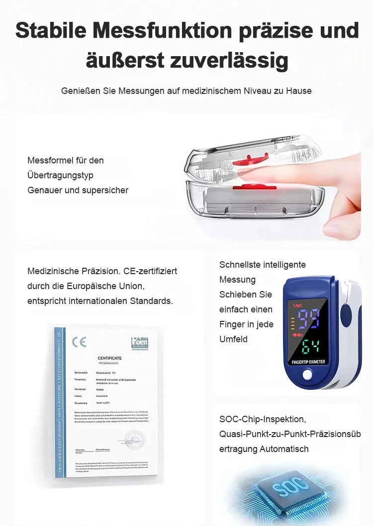 Kein Nadelstich erforderlich, einfach drei Sekunden am Finger befestigen, um Blutzucker, Sauerstoffsättigung und Herzfrequenz zu messen, mit einer Genauigkeit von 99,9 %.